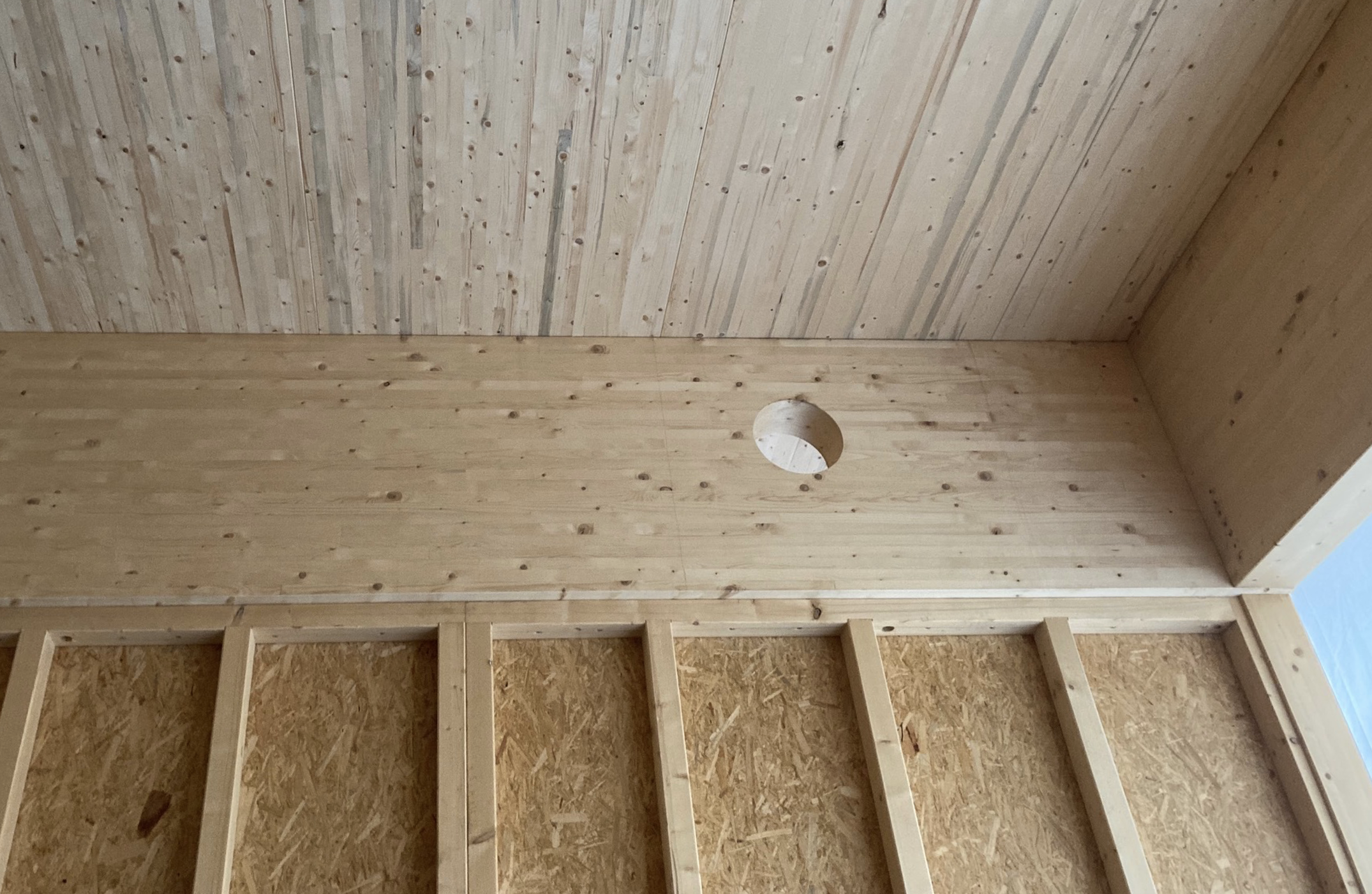 211202_Baustelle_mko2 26. Februar 2022 2150 × 1400 Aktuell Brettstapeldecken auf BSH-Trägern und nicht-tragenden Holzständerwänden – die besonders geformten Stampflehmwände von „Lehm Ton Erde“ sind noch nicht ausgepackt.