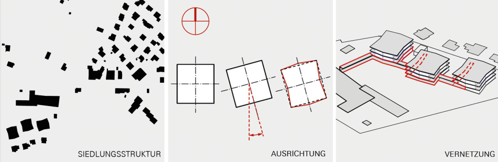 Die Setzung von zunächst zwei gleichwertigen punktförmigen Baukörpern vermittelt städtebaulich zwischen dem großen Volumen des bestehenden Seniorenzentrums und den kleinparzellierten Einfamilienhäusern. Ein dritter Baukörper kann analog im nächsten Bauabschnitt folgen. Die Erschließung der Wohnanlage erfolgt von Süden über die Hengstackerstraße. Wandelgänge verbinden die einzelnen Seniorenwohnhäuser untereinander sowie mit dem Seniorenzentrum und ermöglichen überdachten Aufenthalt im nun gefassten Gartenraum. Die Gestalt der möglicherweise hölzernen Architektur soll durch ihre Transparenz die Landschaft auf den Innenraum beziehen und gleichzeitig eine Atmosphäre der Geborgenheit generieren.